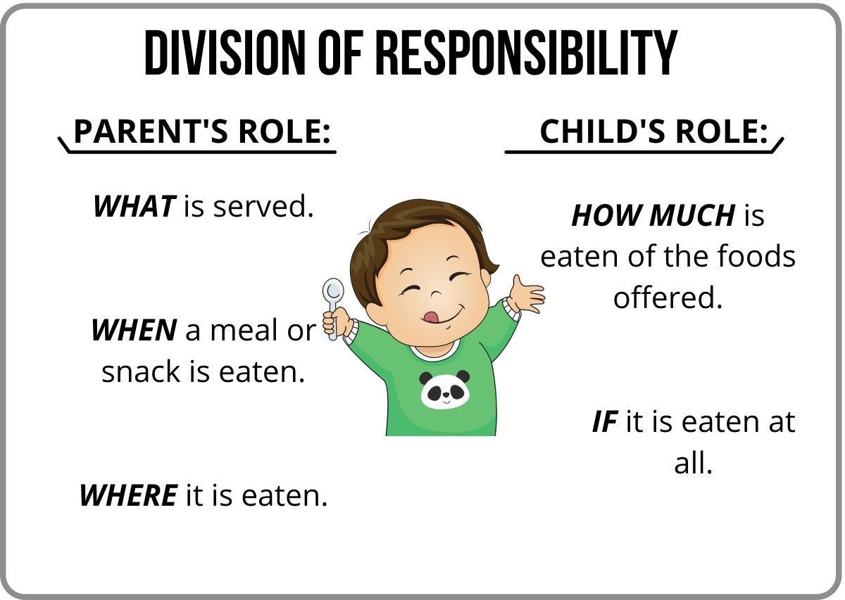 - No bribing, arguing, or negotiating. Take the pressure off. Parents are responsible for WHAT, WHEN, and WHERE food is offered. The child is responsible for IF they eat and HOW MUCH they eat.