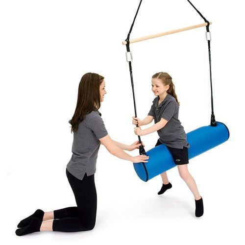 Bolster swings can help with sensory integration, posture, core strength, balance and coordination, anxiety reduction, body awareness, and calming. Kids can sit, stand or lay down on the bolster swing.