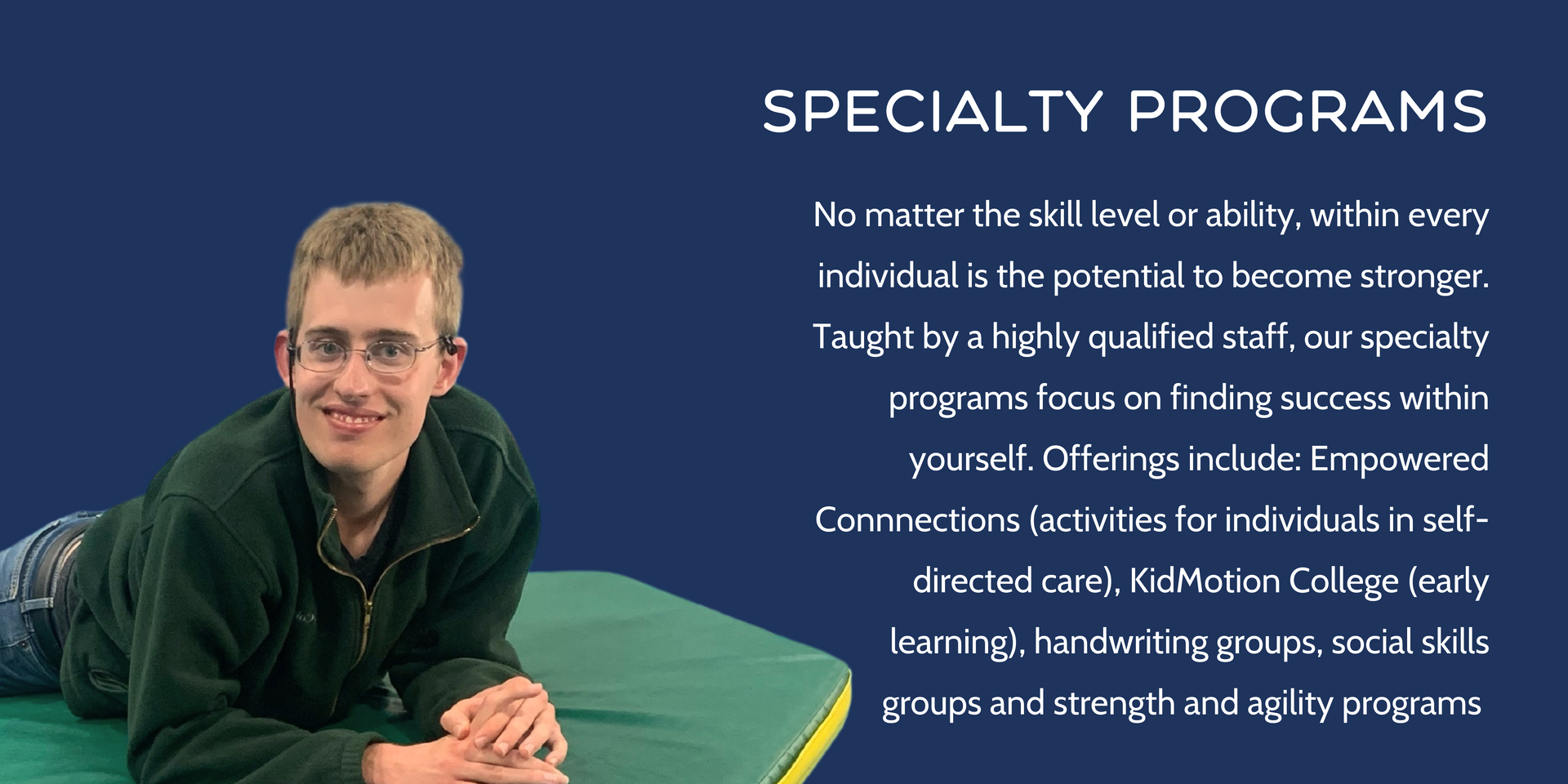 Recreational classes, programs, and events at Pediatric Movement Center (PMC) are for individuals as young as 6 months old to 21 years of age. Our recreational classes, specialty programs and events are offered in an inclusive space that supports and empowers individuals socially, emotionally and physically.